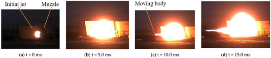The high-speed camera recorded the dynamic characteristics of the launch device, and obtained the development and structural characteristics of the supersonic muzzle jet. Owing to the large amount of charge required to launch the body and its high kinetic energy, the gunpowder burned negatively in the chamber and underwent secondary combustion after being ejected from the muzzle. The resulting muzzle flame made it difficult to determine the shape of the shock wave. As shown in Figure 10a, the moving body traveled at a high speed inside the tube, pushing the air in front of it to form compression waves. These compression waves continuously propagated toward the muzzle but did not spread to it. Figure 10b,c show that the air in the front of the moving body was squeezed out of the muzzle to form the initial jet. The sprayed gas rapidly expanded, resulting in a decrease in pressure and an increase in velocity, and diffused into the environment. The wave front of the initial jet was approximately spherical, with a weak impact force that was one order of magnitude smaller than that of the subsequent gunpowder-induced gas jet. At this point, a small amount of gas leaked from the gap between the moving body and the tube to form a small area of the flame at the muzzle.
