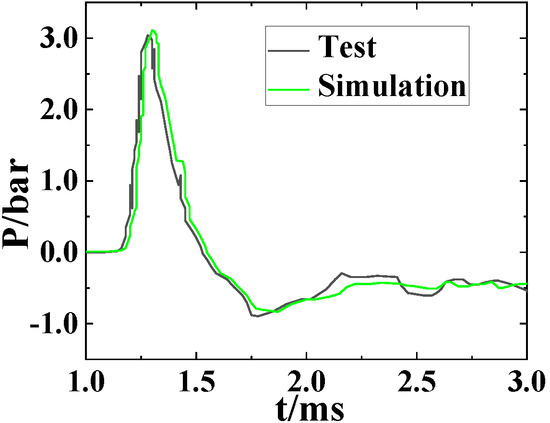 Changes in the pressure at key points were also monitored during the test. Figure 11 compares the curves of pressure versus time between the test and the simulation at the point (3000, 500, and 200 mm), and it is clear that they were consistent. Specifically, the center point of the muzzle is defined as the origin. The X-axis represents the direction of projectile motion, with the Y-axis perpendicular to the X-axis pointing upwards and the Z-axis perpendicular to the XY plane pointing sideways. Therefore, the method of simulation used in this paper could accurately simulate the characteristics of the muzzle jet of the models.