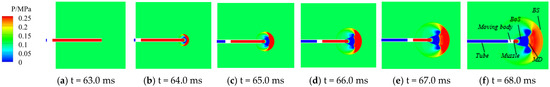 We used the physical model and the model of interior ballistics to determine that, driven by the propellant gas in the tube, the moving body moved for 68.5 ms within the tube before reaching the muzzle. Figure 12 shows the pressure of the initial interference jet formed by compressed air in front of the moving body in the inner tube over time (from 63 ms to 68 ms). As shown in Figure 12a, the initial jet was about to form at 63 ms and the velocity of the moving body was 913.6 m/s at this time. At 63 ms, the moving body is moving inside the tube and the shock wave before it has reached the muzzle. At this point, the initial flow field is about to form and the moving body is 6.5 m away from the muzzle, with a velocity of 901.8 m/s. The pressure at which the shock wave before the projectile reaches the muzzle is approximately 1.1 MPa. Figure 12b–e show that, as the moving body continued to accelerate, the air in front of it was compressed out of the muzzle. The air rapidly expanded, the pressure decreased, and the velocity of the body increased to form the initial jet, including bow-induced shock waves (BS), Mach disks (MD), and bottle shock waves (BoS) (shown in Figure 12f). The body had moved out of the muzzle by 68.5 ms, at which point its velocity was 932 m/s.