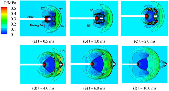 Figure 13 shows the pressure (0.5 ms~10.0 ms) over time in Case 1 (the model with interference by the initial jet) on the plane of symmetry. As shown in Figure 13a, the initial jet had already influenced the area around the muzzle at t = 0.5 ms. High-temperature and high-pressure gas was sprayed out of the muzzle with the movement of the body, expanded rapidly with a reduction in pressure and an increase in velocity, and continuously diffused toward the surrounding area. The coronal shock wave (CS) in front of the moving body encountered the bottle-shaped shock wave (BoS) of the initial jet, leading to a shock–shock collision that led to the disappearance of the CS of the moving body. The structure of the BoS of the initial jet was also destroyed, and it was replaced by two reflected shock waves (RS). The MD of the initial jet was compressed and deformed and led to the formation of the spherical shock wave (SS) of the muzzle jet.