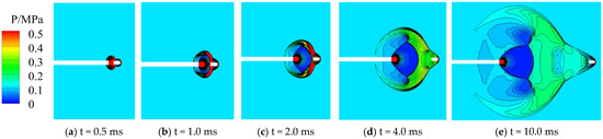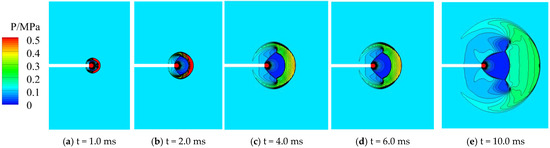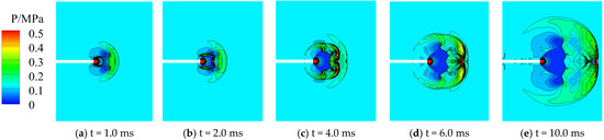 Figure 16 shows changes in pressure in Case 4 (the model without either the projectile or interference by the initial jet) over time on the plane of symmetry. It clearly shows the typical shock wave of the muzzle jet. High-temperature and high-pressure gas was sprayed out of the nozzle, expanded rapidly to reduce the pressure and increase the velocity, and diffused in a 3D symmetrical manner in the surroundings. The phenomenon of a complete wave system consisting of shock waves, including SSs, RSs, and an MD with overlapping discontinuities, has been widely observed.