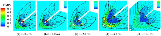The muzzle jet disturbed by the initial jet featured not only shock–shock collisions but also shock–vortex and vortex–vortex interactions. To comprehensively analyze the characteristics of flow in a muzzle jet with interference by the initial jet, we monitored the temporal changes in the vortices as shown in Figure 17a, which shows that the vortex of the initial jet still existed at t = 1.0 ms and was symmetrical. The vortex was located in the low-pressure region, with the streamline pointing from the center to the outside, while the spiral point was stable. As shown in Figure 17c, the strong shock wave of the muzzle jet encountered the weak vortex of the initial jet at t = 2.0 ms and caused it to disappear. A vortex behind the flow field was formed and gradually became clear, as shown in Figure 17d,e.