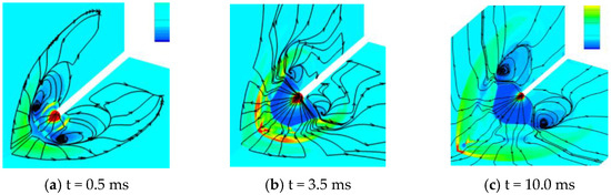 The vortex in Case 2 was relatively simple and clear (as shown in Figure 18) and was formed at around t = 2.0 ms. Due to the absence of interference from the initial jet, the vortex persisted in the low-pressure area, with its streamline pointing from the center to the outside and the spiral point being stable. Compared with Case 1, Case 3 lacked a coupling of the moving body, while its impact on the collision between shock waves and vortices was minor. We can conclude that the development and evolution of vortices in Case 3 were similar to those in Case 1 (as shown in Figure 19).