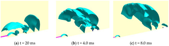 To fully capture the interference by the initial jet in the shock wave of the muzzle jet, Figure 20 shows a schematic diagram of the shock wave in Case 1 at different times. Figure 20a shows that the outermost spherical shock wave of the initial jet surrounded the complex shock wave inside. The muzzle jet was ejected and encountered the shock wave of the initial jet to yield strong shock–shock collisions, shock–vortex collisions, and vortex–vortex collisions that hindered the expansion of the shock wave and formed an area of local high pressure. As shown in Figure 20b, the shock wave of the muzzle jet, which was disturbed by the initial jet, remained complex over time. The spherical shock wave of the muzzle jet broke through the wave front of the spherical shock of the initial jet, and the two wave fronts collided to arrest the expansion of the shock wave and form an area of local high pressure. The bow shock in front of the moving body had already appeared at this time. Figure 20c shows that, as the muzzle jet developed at t = 8.0 ms, the influence of the initial jet almost disappeared and the shock wave gradually became clear and simple.
