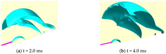 The above results show that the main difference between Cases 1 and 2 was that the speed of expansion of the muzzle jet was lower in the latter case due to the absence of interference by the initial jet, and the degree of enclosure of the moving body weakened to cover only half of its length. The structure of the muzzle jet was clear and distinct, without complex shock–shock collisions or the formation of an additional reflected shock wave. The shape of the muzzle jet was smooth and followed a regular pattern over time. However, under interference from the initial jet, there was no consistent pattern of development of the shock wave in the first 4 ms. The structure of the muzzle jet followed a certain pattern of development until the interference by the initial jet had been completely eliminated.