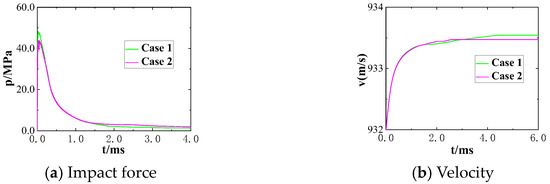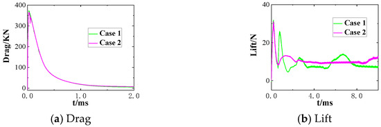 Table 3 shows errors in the parameters of the moving body in the two models (Cases 1 and 2). When a large-caliber weapon and a projectile with a high kinetic energy were used, errors in the drag and lift of both models were about 2.5%, the error in the thrust was about 9%, while the error in velocity was the smallest at 0.01%. These results provide a reference for the analysis of numerical simulation for engineering applications.