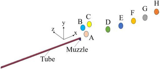 To better understand the pressure distribution in the muzzle jet when it was disturbed by the initial jet, we monitored the changes in pressure over time at several key points. Figure 24 is a schematic diagram of the distribution of pressure at these points and Table 4 shows their locations (with the muzzle as the center).