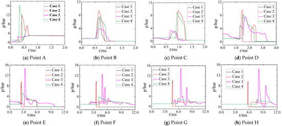 Figure 25 shows a comparison of the changes in static pressure over time at various monitoring points. We sought to determine whether the simplified models (Cases 2–4) could attain the same accuracy as the original model (Case 1) for engineering applications. It is clear from the figure that the changes in pressure in Cases 2 and 4 were the simplest and clearest. That is, when the shock wave passed a given monitoring point, the pressure at it increased and then decreased. Slightly more complex scenarios were encountered in Cases 1 and 3 due to interference from the initial jet. The fluctuations in pressure at the monitoring points near the muzzle were significant and similar. Figure 25a,c show that, due to the proximity of the monitoring point to the muzzle, the latter was located in the region of the expansion wave of the initial jet, and the pressure here was lower than the ambient pressure. Therefore, the pressure of the muzzle jet at the initial moment in Cases 1 and 3 was lower than the ambient pressure (i.e., less than zero relative to the ambient pressure). The monitoring points shown in Figure 25b were not disturbed by the initial jet, because of which the initial pressure at this point in all four models was identical to the environmental pressure. The two monitoring points in Figure 25d,e were located in the high-pressure zone of the initial jet, because of which the pressure at these points was higher than the ambient pressure. The three monitoring points shown in Figure 25f–h were located far from the muzzle such that they were unaffected by the initial jet, and thus their initial pressure was the ambient pressure. The changes in pressure at monitoring points near the muzzle in Cases 1 and 3 were similar because they were severely affected by the initial jet and the effect of coupling of the moving body was not strong. At several monitoring points far from the muzzle, the changes in pressure in Cases 1 and 2 were similar, as the muzzle jet had already separated from interference by the initial jet and was influenced only by its coupling with the moving body.