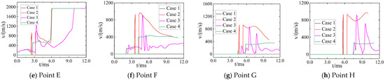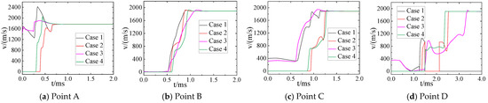 Figure 26 shows a comparison of the changes in the velocity of the moving body over time at each monitoring point. It is clear that the velocity exhibited the same trend as the static pressure over time at each monitoring point. At monitoring points near the muzzle, the changes in velocity in Cases 1 and 3 over time were similar, as both cases involved the initial jet and the effect of coupling of the moving body was not strong. Changes in velocity in Cases 1 and 2 at several monitoring points far from the muzzle were similar because the flow had already separated from interference by the initial jet and was influenced only by the coupling between the muzzle jet and the moving body.