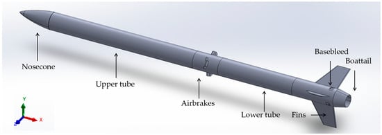 The Eclipse layout is a high-power solid motor rocket, with the payload bay located at the upper tube and the engine and control departments inside the lower tube. The dimensions of the main body, i.e., diameter and length, are determined by EuRoC demands, which dictate the available volume for installing the avionics and all other subsystems (components) required for operating the rocket nominally. To maximize aerodynamic stability, the heaviest components are placed near the nosecone of the rocket to shift the center of mass forward. Meanwhile, a set of three airfoil fins has also been designed and installed at the rear of the rocket. Even though the base bleed unit has not yet been designed at this point, it must be noted that its mass must be as low as possible, so that the center of mass is not shifted afterwards. The overall specifications of the Eclipse at the end of its conceptual design are presented in Table 2.