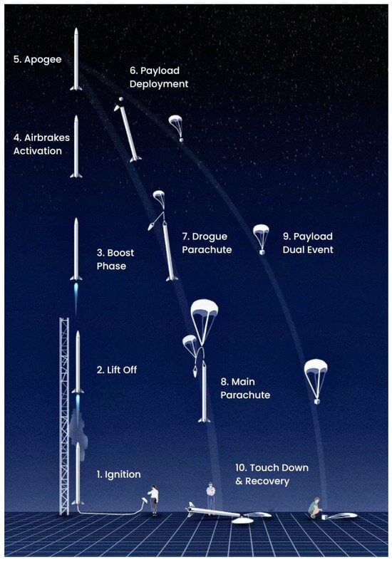 The reference platform for the current study is a high-power rocket configuration, whose mission is to reach a specific apogee under the conditions of the EuRoC competition. More specifically, its mission profile is to takeoff from a stable ground platform, rise to an apogee of 3000 m, deliver the payload via airdrop, and safely glide back to the ground by a system of parachutes (Figure 2). The rest of the Eclipse requirements are summed up in Table 1.