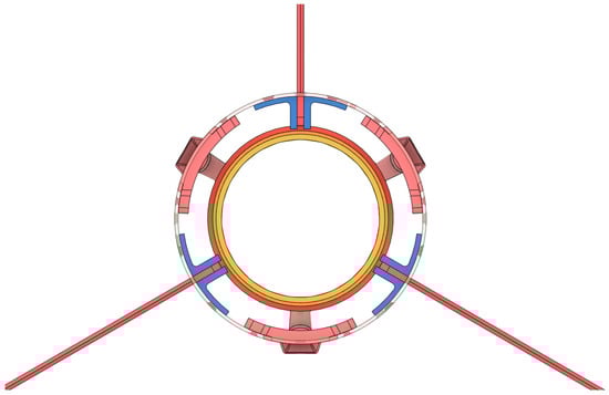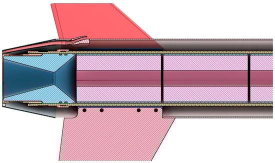 - Structural and volume limitations (radial). As discussed above, the base bleed unit must not intervene with the components and motor layout. Therefore, a radial distance of 15 mm is available, measured from the inner radius of the tube. The innermost structure that defines the aforementioned value is the engine’s heat retainer and cover tube, and the outermost is the internal layer of the rocket’s lower tube, as can be seen in Figure 3 and Figure 4. Different colors are used in Figure 3 and Figure 4 to indicate the presence of different components, i.e., the engine grains (pink), the fins (red), the engine nozzle (light blue), the fins locking mechanism (dark blue), the engine heat retainer (yellow) and the base bleed unit (brown).