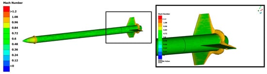 - Synergetic investigation: the k-ω SST turbulence model is used for the same reasons as in the base bleed inlet section. The combination of low and high Reynolds models that can simulate the turbulence by using wall functions and the transport equation when needed constitutes a very compelling aspect of the model. The control volume inlet values of the turbulent kinetic energy (k) and the specific dissipation rate (omega) are inputted as a function of the free-stream velocity and the reference length of the vehicle, derived again from []. The control volume inlet and outlet boundary conditions are chosen as a function of the free-stream velocity (velocity inlet), the free-stream temperature, and the free-stream pressure (pressure outlet). Velocities from Mach 0.3 to 0.9 are used to capture the vast majority of the velocity range of the rocket. Additionally, a simulation with the maximum velocity of 193 m/s that reached an atmospheric pressure at an apogee of 2300 m is run for validation purposes, to match the conditions of the flight test. The control volume size for each analysis is a cube whose length is 24 times the characteristic length of the outlet, whose height is 20 times the characteristic length of the rocket, and whose width is 20 times the characteristic length of the rocket. The target y+ is set to 1, and the corresponding grid consists of 24 million elements.