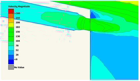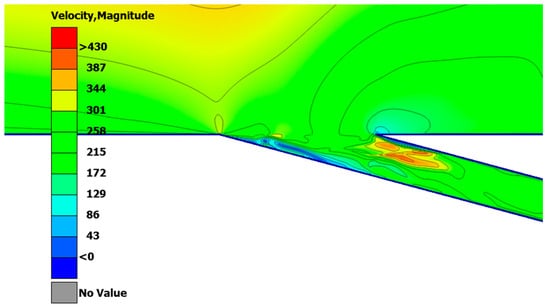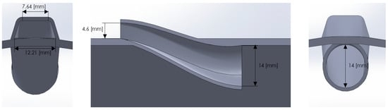 To conclude the inlet design, the protruding geometry needs to be adjusted to eliminate choked flow phenomena after free-stream flow entry into the channel. This is attributed to the channel’s diffuser-type geometry, with its surface area largening axially towards the rocket’s base. The transition of the channel to a nozzle-type channel configuration with a diminishing cross-sectional area axially is selected based on fluid dynamics theory []. This adjustment is employed on the part connecting inlets and outlets as well.