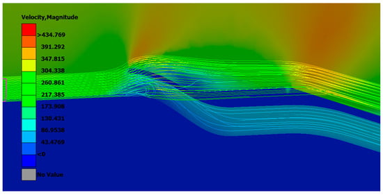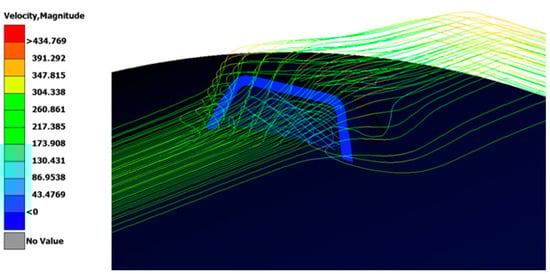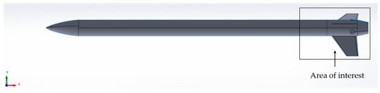- Flow turbulence (longitudinal). To keep the inlet clean of highly turbulent flow, the authors were tasked with the determination of high-turbulence areas that should be avoided. These results showed that the main part of the rocket that introduces turbulence to the incoming flow is the launch rail buttons. The latter are located 2 m from the nosecone of the rocket in the longitudinal direction and extend for 0.1 m more in the longitudinal direction (Figure 5). Hence, the base bleed inlet must be located at least 0.1 m further downstream from the launch rail buttons.