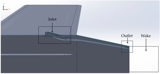 In the study phase for the apparatus’s inlet configurations, two distinct design scenarios are evaluated: (i) the integration of angled circular holes in the rocket’s body tube, referred to as “bleed holes”, and (ii) the implementation of geometries protruding from the rocket’s body, named “protruding geometries”. Earlier research and implementation on the topic of base bleeds saw only bleed hole configurations being used []. The introduction of a protruding geometry is introduced in the current study to significantly enhance air mass flow, thereby improving efficiency. More specifically, 3 mm and 6 mm bleed holes with a fifteen-degree angle are tested, as seen in []. A novel protruding inlet design is created inspired by [] and scaled to fit the rocket’s dimensions.