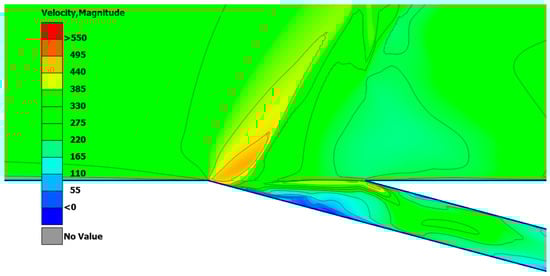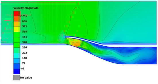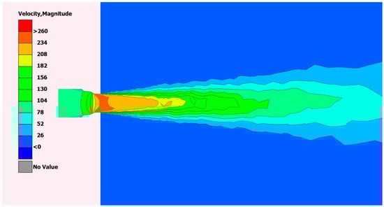 - Base bleed outlet investigation: The outlet is treated differently from the inlet component as the priority now shifts towards calculating the mixing flow of the jet flow []. A high Reynolds model is used as the importance of near-wall functions is negligible. More specifically, the K-e realizable model is used as it is preferred for jet flows that include non-rotational fluid areas. The control volume inlet and outlet boundary conditions were directly taken from the previously conducted base bleed inlet analysis as the outflow conditions of the base bleed inlet, and they practically match the inflow conditions of the base bleed outlet. A control volume velocity inlet boundary condition is selected with velocities in a range of 0.17–0.32 M, as the base bleed inlet analysis results indicated, and a control volume pressure outlet boundary with ambient pressure was also used, as is the case in the literature [,,,]. Again, the control volume size for each base bleed outlet analysis is a cube whose length is 17 times the characteristic length of the base bleed outlet, the height is 14 times the characteristic length of the base bleed outlet, and the width is 14 times the characteristic length of the base bleed outlet. Finally, no grid dependency study is conducted as the design period was limited by timeline restrictions, and y+ convergence was deemed satisfactory. The grid is comprised of 500 thousand elements that provide enough resolution for the solver to reach the targeted value of y+, which is set to 30.