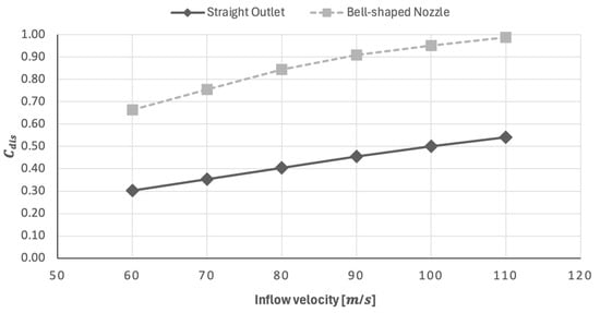 As for the outlet part, the metric used to evaluate the part’s efficiency is the discharge coefficient, derived from [] and defined as shown in Equation (4).