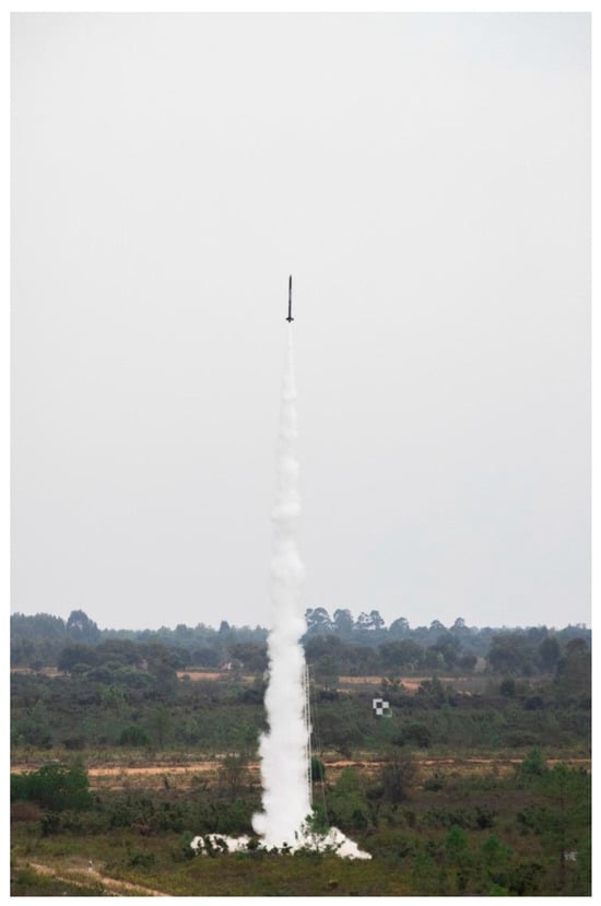 The data from the flight conducted in the context of the EuRoC served as validation for the CFD model used to evaluate base bleed unit’s efficiency. This test flight was conducted on 13 October 2023 under the supervision of the EuRoC authorities, the European Space Agency and the Portugal Space Agency (Figure 24). The flight ascend phase lasted 24 s, reaching an apogee of approximately 2400 m. The maximum speed was 193 [m/s], not reaching the intended 294 [m/s] due to an early braking sequence triggered by an electronics malfunction.