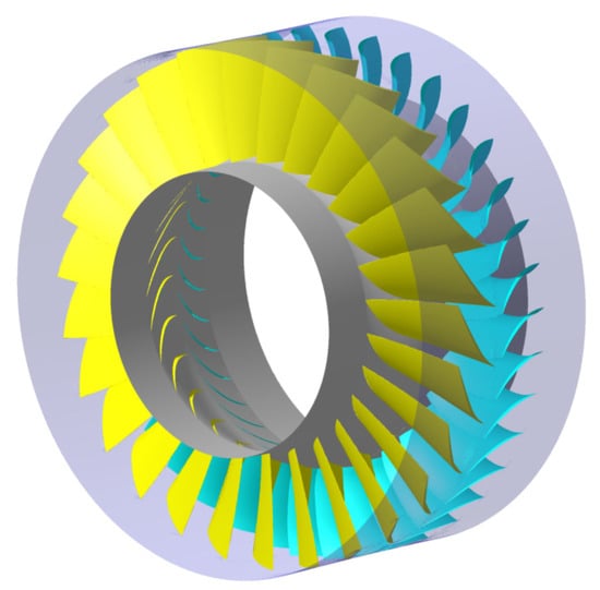 - Eshraghi, H.; Boroomand, M.; Tousi, A.M. Design and Analysis of a Highly Loaded Tandem Compressor Stage. In Proceedings of the ASME 2014 International Mechanical Engineering Congress and Exposition, Montreal, QC, Canada, 14–20 November 2014; American Society of Mechanical Engineers Digital Collection. American Society of Mechanical Engineers: New York, NY, USA, 2015. [Google Scholar] [CrossRef]
