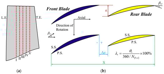where represents the number of blades, which is 27 in this paper. It is specified that is positive when the rear blade deflects along the rotor rotation direction, and the axial position parameter can be positive or negative. When is positive, the front and rear blades do not overlap axially. On the contrary, when is positive, there is axial overlap between the front and rear blades.