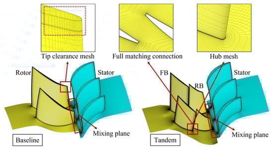 To ensure the comparability of research conclusions between the Baseline and the tandem-rotor stage, the same design principle of the tandem rotor was followed. As shown in Figure 2b, the single-blade rotor is divided into the front blade and the rear blade for the tandem-rotor stage based on the Baseline. Subsequently, the total axial chord length (X) of the front and rear blades is adjusted to be equal to the axial chord length of the Baseline rotor. Meanwhile, the value of is selected to be +1 mm. To ensure that the rear blade is adjusted to match the outlet flow of the front blade, adjust the inlet angle of the rear blade to maintain the incident angle at the design point operating condition to be zero. Meanwhile, the total blade turning angle of the front and rear blades is equal to the blade turning angle of the Baseline rotor. In the process of tandem-rotor design, the original parameters, such as the meridional flow path, number of blades, inlet and outlet flow angle, blade angle, throat area, etc., are kept consistent with those of the Baseline. Based on the above design principle, the tandem-rotor stages with different tandem parameters ( and ) can be obtained.