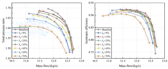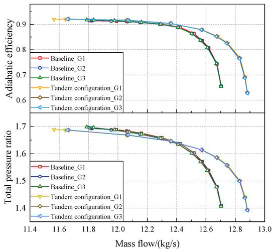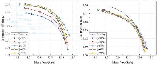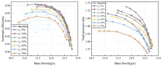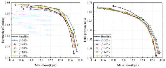 Furthermore, the aerodynamic performance differences between the tandem-rotor stages and the Baseline at the design rotational speed were determined (Figure 7). When the tandem-rotor configurations ( 50%, 60%, and 70%) were adopted, the efficiency of the stage significantly improved, and the flow capacity of the tandem-rotor stage was also further increased. The flow margin is widened, which means that the stable operating range of the tandem-rotor stage is broader. When the flow rate is greater than 12.4 kg/s, the tandem-rotor stage can achieve a positive benefit in total pressure ratio. When the flow rate is less than 12.4 kg/s, although the total pressure ratio of the tandem-rotor stage may slightly decrease, the maximum total pressure ratio value between the tandem-rotor stage and Baseline is almost the same. Therefore, the tandem rotor can improve the aerodynamic performance of the ultra-highly loaded stage. In addition, tandem-rotor stages with different values also exhibit different patterns in aerodynamic performance. The efficiency of the tandem-rotor stage is lower at the NS and higher at the NC when = 60% and 70%. However, it is superior to the Baseline overall. When = 50%, the efficiency of the tandem-rotor stage is high across the entire operating range. When = 30% and 40%, the efficiency of the tandem-rotor stage is higher than the Baseline only at the NC.