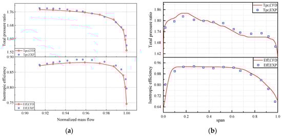 (a) Compressor characteristics curves. (b) Radial distributions of the total pressure ratio and isentropic efficiency.
