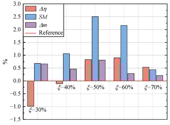 Based on the tandem-rotor stage design principle, as described above, the tandem-rotor stages with different meridional division positions were developed. The circumferential relative position between the front and rear blades was maintained at = 15%. This section aims to explore the impact of different meridional division positions on the performance of tandem-rotor stage and the internal flow mechanism. In this section, five different tandem-rotor stages with meridional division positions of 30%, 40%, 50%, 60%, and 70% are considered. Figure 6 presents the performance gains of peak isentropic efficiency (PE), stall margin (SM), and choke point mass flow rate (mchoke). These performance variation parameters are defined as follows: