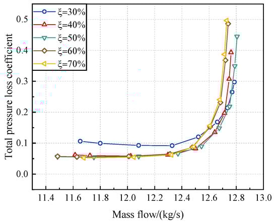 Figure 9 shows the aerodynamic performance comparison of stators of tandem-rotor stages with different division positions. When the flow rate is less than 12.6 kg/s, the stator has the highest Cpt compared to other tandem-rotor stages when = 30% after the tandem-rotor stage departs from the NC. Furthermore, the variation in the Cpt of the stator is not significant when changes. The Cpt shows almost no difference especially when the compressor is far from the NC. Based on this, it can be inferred that the aerodynamic performance of tandem-rotor stage is mainly determined by the tandem rotor. Therefore, the aerodynamic performance and internal flow mechanism of the tandem rotor should be further investigated for the research on tandem-rotor stages with different meridional division positions.