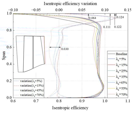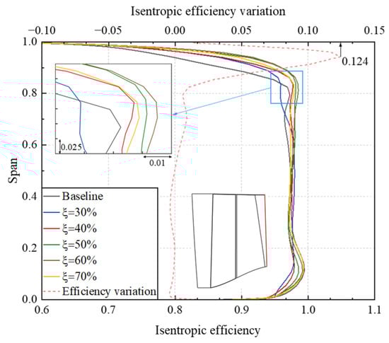Compared to the Baseline, the PE of the tandem-rotor stage is significantly improved when = 50%, 60%, and 70%. To explore the influence of different meridional division positions on the performance of the tandem rotor and the internal flow mechanism, it is essential to clarify the fundamental reasons for the efficiency improvement. Figure 10 presents the comparison of the circumferential averaged isentropic efficiency spanwise at the tandem rotor outlet and Baseline rotor outlet. Efficiency variation is calculated by subtracting the efficiency of the Baseline at the same span from that of the = 60% tandem rotor.