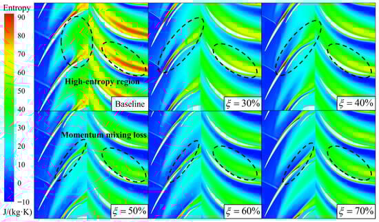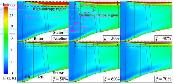 Furthermore, Figure 11 presents the meridional view of the circumferential averaged entropy distribution of tandem rotors with different meridional division positions. It can be observed that the entropy distribution in the lower span region of the tandem rotor shows no significant difference compared to the entropy distribution in the lower span region of the Baseline. However, the = 50%, 60%, and 70% tandem rotors exhibit a noticeable reduction in high-entropy region near the tip compared to the Baseline. It is precisely due to the reduction in high-entropy region near the tip that the isentropic efficiency of the = 50%, 60%, and 70% tandem rotors is higher than that of the Baseline. However, for the = 30% and 40% tandem rotors, although the high-entropy region near the tip is smaller, there is an increase in the moderate entropy region from approximately 70% span to 90% span, which leads to lower isentropic efficiency.