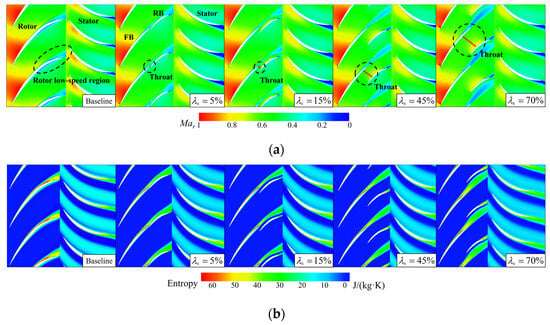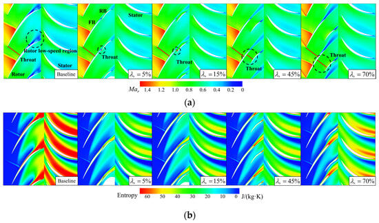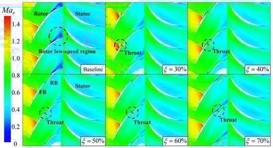 Initially, to elucidate the reasons for the differences in isentropic efficiency of the tandem rotor tip region, Figure 22 illustrates the relative Mach number contour and entropy contour at 95% span. From the distribution of Mar, it can be observed that a contraction channel is formed between the front blade P.S. and the rear blade S.S. when = 5% and 15%. The throat is located at the T.E. of the front blade, where the airflow passing through this contraction channel is accelerated. The accumulation of the low-energy fluid near the front blade T.E. is inhibited. The distinct difference is that a converging–diverging channel is formed between the front blade P.S. and the rear blade S.S. The throat of the converging–diverging channel moves towards the front blade L.E. compared with that of the Baseline. The airflow passing through this converging–diverging channel accelerates first and then diffuses, causing an increase in static pressure and deceleration after the throat. In addition, it is worth noting that the interaction between the airflow from front blade and the solid wall of rear blade S.S. leads to the Coanda effect [] when the values of are small, which deflects the airflow to rear blade S.S and inhibits the wake width of the front blade significantly. Nevertheless, as increases, Coanda effect gradually disappears. As a result, the low-energy fluid accumulates at the front blade T.E. and near the rear blade P.S. when the values of are too large.