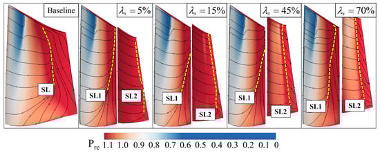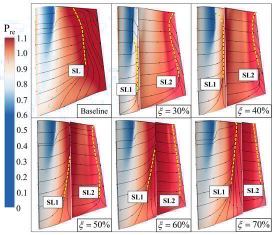For the purpose of revealing the differences of flow characteristics in the rotor of tandem configurations with different meridional division positions, Figure 14 shows the limiting streamlines of rotor suction side (S.S.). Firstly, there is a separation line (SL) generated by shock wave/boundary layer interaction near the blade L.E. for both the Baseline and tandem rotors. However, the difference is that a clear SL appears on the Baseline rotor suction side, and the secondary flow structure after the SL is very obvious. On the one hand, the rotor camber angle is large due to the high loading level. The airflow continues to decelerate in the diffusion channel composed of adjacent blades. Thus, it is difficult for the boundary layer flow with low momentum level to resist the strong adverse pressure gradient, resulting in a large boundary layer flow separation. On the other hand, the radial transport capacity of the low-energy fluid near the wall of the rotor is enhanced, which migrates to the tip and middle of the rotor. After the single rotor is divided into two blades, the SL is also divided into two (SL1 and SL2). When = 50% and 60%, the SL is located below about 60% span of the front blade (SL1) and at the T.E. of the rear blade (SL2), respectively. It can be seen that the overall strength of the rotor S.S. flow separation is obviously weakened, especially in the region above 60% span. Thus, it can be approximately considered that the SL in the region above 60% span is delayed to the rear blade T.E. Therefore, the = 50% and 60% tandem rotors’ limiting streamlines are more uniform, and the radial transport capacity of the low-energy fluid near the wall of the rotor is inhibited significantly, which is the main reason why the efficiency of = 50% and 60% tandem rotors in the region above 60% span is higher than that of Baseline. Then, the = 60% tandem rotor with the best performance is selected to be compared with the Baseline regarding the blade loading distribution. The rotor S.S. static pressure is normalized and characterized by reduced static pressure (Pre), which is defined as follows: