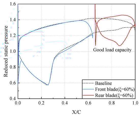 As shown in Figure 15, the loading distributions of the front blade of the tandem rotor and Baseline rotor are basically the same at 95% span, and the main difference is in the rear blade. The adverse pressure gradient of the Baseline S.S. is very strong. Moreover, the boundary layer flow with a low momentum level makes it difficult to overcome this adverse pressure gradient, resulting in large-scale flow separation. However, for the = 60% tandem rotor, the adverse pressure gradient of the rear blade S.S. is reduced, and the airflow passing through the rear blade S.S. accelerates first and then diffuses. Thus, the boundary layer flow can smoothly pass through the T.E. of the blade, avoiding the accumulation of low-energy fluid. That is the reason why the tandem rotor exhibits a better ability to suppress flow separation on the blade S.S. even though the overall loading on the rotor is high and the overall camber angle of the tandem rotor is as large as that of the Baseline rotor.