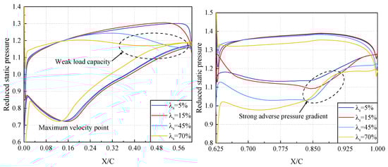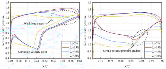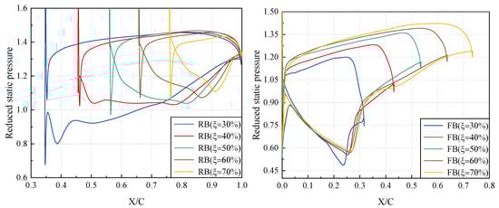 To further reveal the influence of different meridional division positions on the internal flow mechanism of the tandem rotor, Figure 16 illustrates the loading distribution at 95% span for the front and rear blades of tandem rotors with different meridional division positions, which mainly affect the loading ratio of the front and rear of blades. When = 30% and 40% (the chord length of the rear blade is longer), the loading level of the rear blade is high. Thus, the loading distribution between the front and rear blades is not uneven. For the = 30% tandem rotor, the momentum level of the airflow is low because the positive pressure gradient acceleration section of the rear blade S.S. is shorter than the chord length. Meanwhile, because the adverse pressure gradient is highest when = 30%, the boundary layer flow separation strength of the rear blade S.S. is the most severe among all tandem configurations (Figure 14). The = 40% tandem rotor has similarities with = 30%, where the positive pressure gradient acceleration section of the rear blade S.S. is short. Subsequently, the airflow undergoes a brief deceleration after reaching the lowest static pressure level, and the static pressure level basically does not change. Then, the diffusion of the airflow quickly completes, leading to a strong adverse pressure gradient. As a result, the boundary layer flow separation strength is still more severe than that of = 50%, 60%, and 70% tandem rotors. This is also the reason why the isentropic efficiency of = 30% and 40% tandem rotors is lower than that of = 50% and 60% tandem rotors in the region above 60% span. The chord length of the front blade should not be excessively long, either. When = 70%, although the loading distribution of the rear blade is still acceptable, the adverse pressure gradient of the front blade S.S. is strong. The separation line (SL1) reappears above 60% span of the front blade, which weakens the effectiveness of using tandem rotor to inhibit the boundary layer flow separation. When = 50% and 60%, the airflow faces a moderately adverse pressure gradient after passing through the shock wave on the suction side, while the momentum level of the flow at the rear blade T.E. is high after acceleration. Therefore, the boundary layer flow separation of both the front and rear blades of the = 50% and 60% tandem rotors is significantly suppressed, resulting in high efficiency and minimal energy loss.