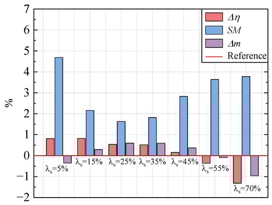 Figure 17 presents the performance gains of PE, SM, and mchoke. According to Figure 17, the performance of the tandem-rotor stages with different circumferential relative position parameters exhibits certain patterns. The PE shows an overall trend of gradual decrease as the increases. The PE reaches its maximum when = 5% and 15%. Meanwhile, the = 70% tandem-rotor stage exhibits the lowest PE, with a difference of up to 2.14% from the maximum. In contrast to the pattern seen in PE, mchoke initially rises and then decreases as the increases. The trend of SM follows a similar pattern to that of mchoke, as it increases and then decreases with the increase in the . However, the difference is that SM always remains positive.