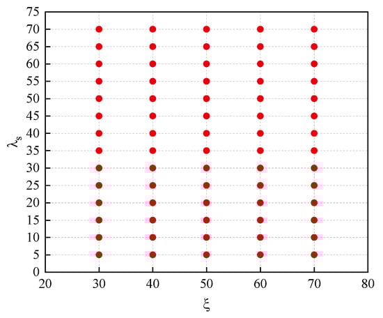 In order to further summarize the design matching rules between the front and rear blades of tandem rotor, a detailed numerical simulation study is needed to investigate the coupling mechanism of the parameter and parameter on the aerodynamic performance of ultra-highly loaded single-stage compressors. Figure 27 presents the selections of various tandem rotor design parameters. In this section, five meridional division position parameters are selected: = 30%, 40%, 50%, 60%, and 70%. Additionally, at each meridional split position parameter, 14 circumferential relative position parameters are selected: = 5%, 10%, 15%, 20%, 25%, 30%, 35%, 40%, 45%, 50%, 55%, 60%, 65%, and 70%. Therefore, a total of 70 different tandem rotor design schemes were generated.