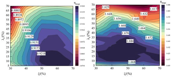 Figure 28 illustrates design maps of performance variations in the tandem-rotor stages with different tandem parameters. The PE of the tandem-rotor stage ranges from 87.94% to 92.40%. The difference between the maximum and minimum values is approximately 4.46%, and PE attains the maximum value when is larger and is smaller. The total pressure ratio at the PE of the tandem rotor varies from 1.609 to 1.688. The maximum value changing by approximately 4.90% relative to the minimum value, and the total pressure ratio attains the maximum value when is smaller. Meanwhile, the sensitivity of efficiency and total pressure ratio to different tandem parameters also varies significantly. Initially, when is large, the stage efficiency shows a higher sensitivity to the tandem parameter . As decreases, the sensitivity of efficiency to gradually diminishes. In contrast, the total pressure ratio is insensitive to variations in parameter . Then both the stage efficiency and total pressure ratio exhibit high sensitivity to changes in the parameter when is smaller, which indicates that the stage efficiency and total pressure ratio decrease rapidly with the increase in when is smaller. However, the declining trend of stage efficiency slows down due to the sensitivity of stage efficiency to decreases. But the sensitivity of total pressure ratio to continues to strengthen. The total pressure ratio rapidly decreases with an increase in when = 70%. Resultantly, variations in tandem parameters do not result in significant performance fluctuations near the optimal point of efficiency for the tandem-rotor stage. Conversely, variations in tandem parameters will lead to substantial fluctuations of the performance of the tandem-rotor when tandem-rotor stage performance is poor.