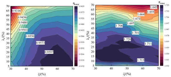 Additionally, Figure 29 illustrates the design maps of performance variations in the tandem rotors with different tandem parameters. The PE of the tandem rotor ranges from 91.52% to 96.20%. The difference between the maximum and minimum values is approximately 4.68%, and PE attains the maximum value when is large and is small. The total pressure ratio at the PE of the tandem rotor varies from 1.632 to 1.725. The maximum value changes by approximately 5.51% relative to the minimum value and attains the maximum value when and are smaller. Upon comparing the performance maps of tandem-rotor stage and tandem rotor, it becomes apparent that the trends in tandem rotor performance variations and the sensitivity of tandem rotor performance to tandem parameters are largely similar to those observed in tandem-rotor stage. This indicates that the performance of tandem rotor plays a dominant role in determining overall stage performance. However, the difference lies in the fact that tandem rotor exhibits a higher level of performance over a broader parameter selection range, indicating that tandem rotor also has an impact on the downstream stator performance. In consequence, in the application of tandem rotor technology, careful consideration should also be given to the design of downstream stator for optimal matching. In summary, it is recommended to utilize larger meridional division position parameters and smaller circumferential relative position parameters to enhance isentropic efficiency while balancing the level of total pressure ratio for the tandem rotor.