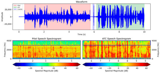 As shown in Figure 3, the red-bordered section represents the pilot’s voice, whereas the green-bordered section represents the air traffic controller’s voice. Analyzing the waveform and spectrogram, it is evident that in comparison to the clear voice from the air traffic controller’s end, the pilot’s voice contains a low-frequency noise at approximately 1000 Hz. This continuous noise on the pilot’s side causes the voice envelope to become less distinct and challenging to discern. In the spectrogram, the voice of the pilot has been band-pass filtered between 30 Hz and 3000 Hz, resulting in the loss of both high- and low-frequency features. Additionally, the audio waveform from the pilot’s end is relatively weaker, which severely degrades the voice communication quality.