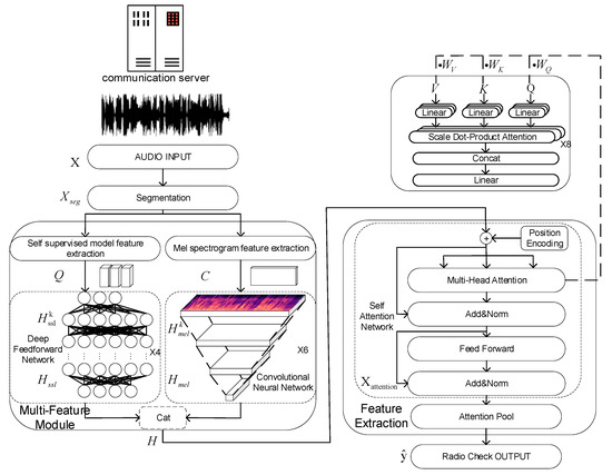For variable-length audio inputs, extracting the overall audio quality from the temporal domain requires more than merely averaging the vectors of segments. Simple averaging does not effectively utilize the temporal information of the audio. Therefore, a transformer-based feature extraction module is utilized to extract audio quality in the temporal domain. The pre-trained feature extraction network not only focuses on the composite feature vectors of segments performing exceptionally well or poorly but also scores based on the overall quality of the speech signal globally, leveraging the audio’s temporal data. After processing all audio segments of the test audio, an attention pool is used to pool all feature vectors, yielding the final radio check score.