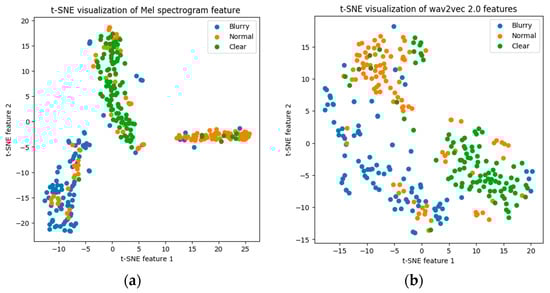 t-SNE visualization of mel spectrogram feature and wav2vec2.0 feature. (a) Shows the t-SNE visualization of Mel spectrogram features. (b) Shows the t-SNE visualization of wav2vec 2.0 features.