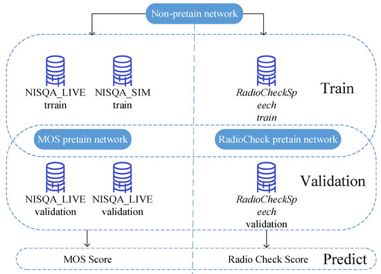 This research aims to automate radio check scoring using well-established theoretical models for mean opinion score (MOS) prediction. Therefore, prior to radio check score prediction, the same model was employed for corresponding MOS score prediction to validate the model’s effectiveness. As perceived differences between MOS and radio check scores were identified in Chapter 2, addressing the disparity required the use of distinct training sets for model training. Accordingly, training and validation for MOS score prediction were conducted with the NISQA_LIVE and NISQA_SIM subsets of the publicly available NISQA dataset, using the same procedures as NISQA. Additionally, for radio check score prediction, 80% of the RadioCheckSpeech dataset was used for training, while 20% was reserved for validation, as depicted in the following Figure 7.