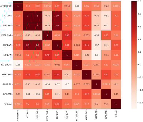 From the heat map of the Pearson correlation coefficient, it can be seen that the correlation between the parameters ATT.Roll and EKF1.Roll reaches 1, indicating that these two parameters are perfectly correlated. In addition, the correlation of the EKF1.VN parameter with the ATT.Roll and EKF1.Roll parameters is also high. Therefore, the two parameters ATT.Roll and EKF1.Roll must be traded off.