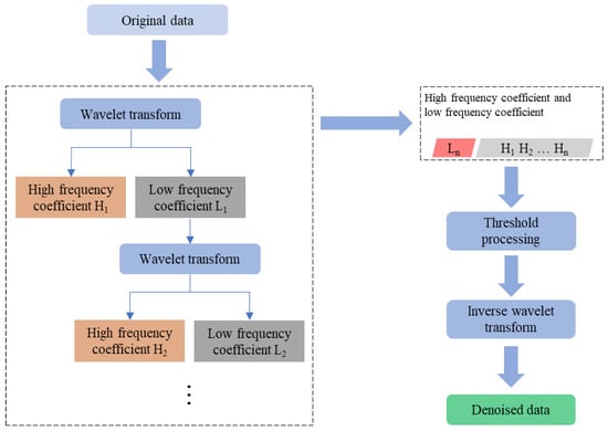 If anomaly detection is performed directly without denoising the noisy data, it is also difficult for the deep model to obtain good learning and classification recognition results. Wavelet decomposition is a signal time–frequency analysis method with good performance in multi-resolution detail analysis. Signal-to-noise separation using wavelet decomposition can largely suppress noise and retain the singular information of the original signal well, which is a simple and effective method []. Figure 2 illustrates the primary process of noise reduction through wavelet decomposition, which involves three main steps.
