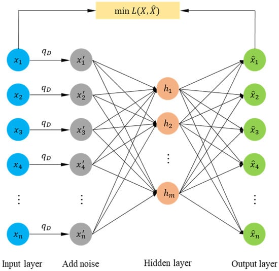 Denoising autoencoder is an extension of the traditional autoencoder. It adds noise to input data based on the autoencoder and then reconstructs “clean” data from noisy input data by training the network. Compared with traditional autoencoder, the denoising autoencoder can learn more robust feature representation and has good generalization ability []. The structure of the DAE is shown in Figure 4.