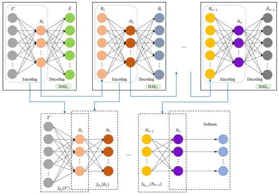 The traditional denoising autoencoder is improved based on the standard autoencoder, which only consists of an encoder and a decoder, while the stacked denoising autoencoder is a deep learning model that stacks multiple denoising autoencoders. The stacked denoising autoencoder utilizes the encoder output of the i-th denoising autoencoder as the encoder input of the i + 1 denoising autoencoder. Greedy training is then completed layer by layer. Compared with the denoising autoencoder, the stacked denoising autoencoder has a deeper network structure and can learn deeper feature representations from input data in an unsupervised manner. Then, the deep feature representations learned by SDAE are input into the softmax classifier. Finally, a small amount of labeled data is used for network fine-tuning to achieve the anomaly classification recognition of UAV flight data. The structure of the stacked noise reduction self-encoder is shown in Figure 5 [].