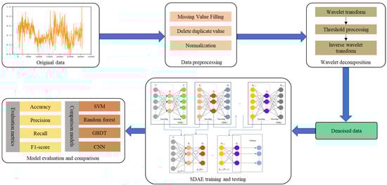 Firstly, we perform necessary preprocessing operations on the raw data to achieve the deletion of duplicate values, the supplement of missing values, and the normalization of data. Secondly, the wavelet decomposition method is used to denoise the preprocessed data to overcome the impact of noise on the subsequent model detection effect. Thirdly, the data are divided into training and test sets. The training set is used to train the stacked denoising autoencoder network and the softmax classifier as well as optimize the model parameters. Finally, the model’s effectiveness is validated on the test dataset and compared with other models to demonstrate the advantages of the proposed method.