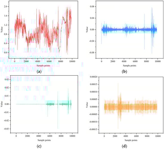 Firstly, we used wavelet decomposition with the db4 wavelet basis function and soft thresholding processing to denoise the preprocessed data. For example, we decomposed the AHR2. Then, we rolled parameter data into high-frequency and low-frequency data using wavelet decomposition and reconstruction. Figure 7 shows (a) the low-frequency component after three-level wavelet decomposition, (b) the high-frequency component after one-layer wavelet decomposition, (c) the wavelet component after two-layer decomposition, and (d) the low-frequency component after three-layer wavelet decomposition.